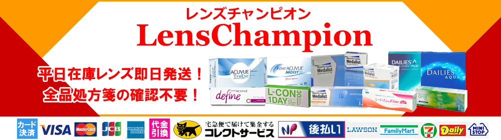 コンタクトレンズ通販レンズチャンピオンです。在庫のあるコンタクトレンズは平日17時まで注文で当日発送。最短で本州エリアは翌日お届け。1万円購入で送料も代引・後払手数料も無料です。ワンデーや2ウィーク、乱視用や遠近両用も在庫があります。カラーもワンデーアキュビューディファインやネオサイトワンデーリングなら在庫がございます。マンションの宅配ボックスや「玄関先への置き配」やヤマト運輸の配送センターへのお届けも可能です。