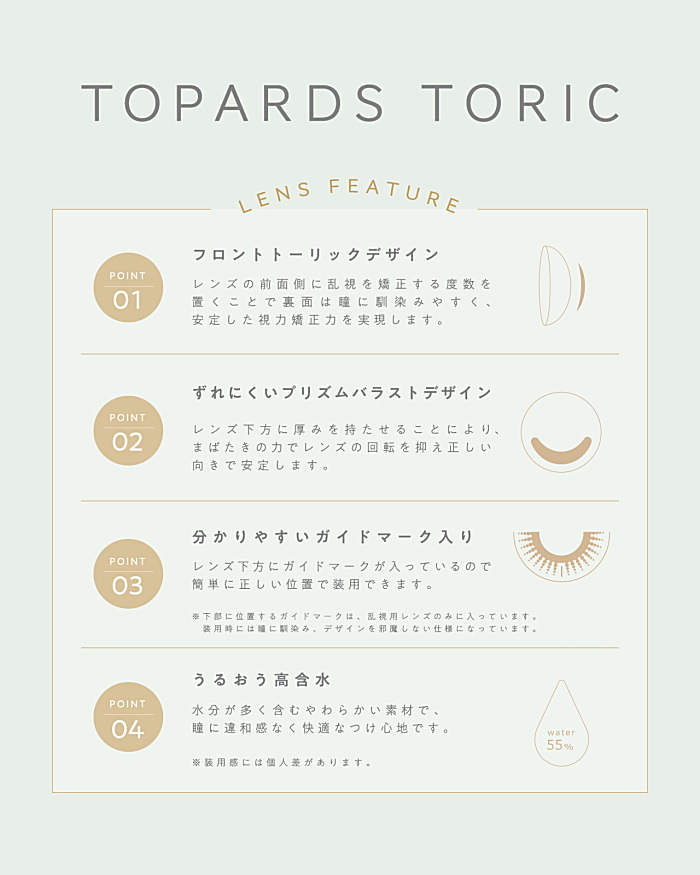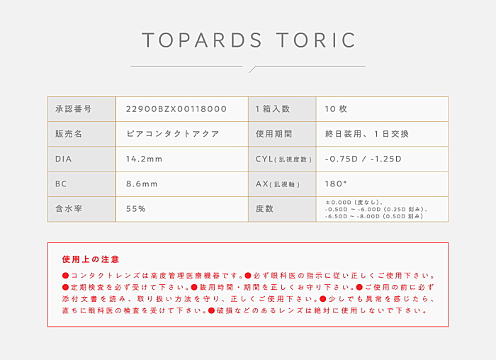 トパーズ 乱視用トーリック人気のカラコンのトパーズに乱視用のトパーズトーリックができました。なじみやすいブラウンベースでカラーはストロベリークォーツ、デートトパーズ、オパールの3色です。乱視があるからカラコンが使えないと諦めていた人にもこれならOKです。1箱10枚入り 1,760円(税込)BCは8.6mmのみ、CYLは-0.75と-1.25、Axは180のみ、DIAは14.2mmのみご注文はカラーはSPHとCYLと箱数をご選択ください。注 文右 左右左色カラー選択ストロベリークォーツデートトパーズオパールカラー選択ストロベリークォーツデートトパーズオパールPWRSPH(度数)SPH 0.00SPH-0.50SPH-0.75SPH-1.00SPH-1.25SPH-1.50SPH-1.75SPH-2.00SPH-2.25SPH-2.50SPH-2.75SPH-3.00SPH-3.25SPH-3.50SPH-3.75SPH-4.00SPH-4.25SPH-4.50SPH-4.75SPH-5.00SPH-5.25SPH-5.50SPH-5.75SPH-6.00SPH-6.50SPH-7.00SPH-7.50SPH-8.00SPH(度数)SPH 0.00SPH-0.50SPH-0.75SPH-1.00SPH-1.25SPH-1.50SPH-1.75SPH-2.00SPH-2.25SPH-2.50SPH-2.75SPH-3.00SPH-3.25SPH-3.50SPH-3.75SPH-4.00SPH-4.25SPH-4.50SPH-4.75SPH-5.00SPH-5.25SPH-5.50SPH-5.75SPH-6.00SPH-6.50SPH-7.00SPH-7.50SPH-8.00CYL CYL(度数)CYL-0.75CYL-1.25CYL(度数)CYL-0.75CYL-1.25 Ax数 量箱 数12345678箱 数12345678注 文乱視用のワンデーカラコン度なしと近視用のトパーズは以前からあったけど、その中でも人気カラーのストロベリークォーツ、デートトパーズ、オパールの3色を乱視用にしました。乱視度数はCYL-0.75と-1.25の2つです。軸度はAx180°のみです。トパーズトーリック(乱視用)のスペック商品名:トパーズ トーリック(乱視用)英語名:TOPARDS TORICカラー:ストロベリークォーツ、デートトパーズ、オパールBC:8.60mmDIA:14.2mmPWR度数:±0.00、-0.50 ~ -6.00 (0.25 step)、-6.50 ~ -8.00(0.50 step)CYL(乱視度数):-0.75Dと-1.25DAXIS(乱視軸):180°含水率 55%レンズデザイン:フロントトーリック型プリズムバラスト製造販売元:PIA株式会社医療用具承認番号:22900BZX001180001箱 10枚入り