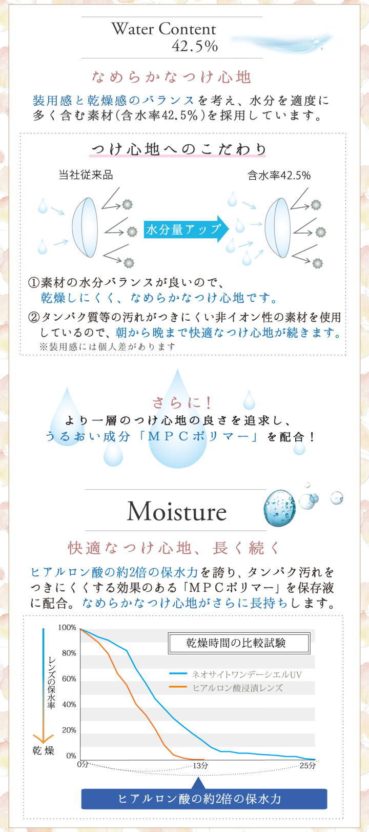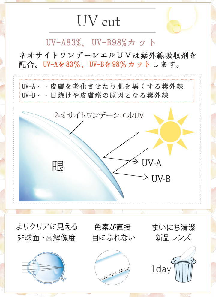 ネオサイトワンデーシエルUVネオサイトワンデーシエルUVに新たなカラーが加わりました。となりのあの子、君のきらめき、シエルブラウン、シエルグリーン、シエルベージュ、エルグレージュ、シエルピンク、ウォーターミント、アクアコーラルの全9色です。ネオサイトリングと比べるとスリートーンで深みのある自然な発色が特長です。4箱購入でクオカード500円分プレゼント中♪ 8箱なら1,000円分です。1箱30枚入り 3,920円(税込)BCは8.6mmのみDIAは14.2mmのみ ご注文はカラーとPWRと箱数を選択してください。注 文右 左右左カラー カラー選択となりのあの子君のきらめきシエルブラウンシエルグリーンシエルベージュシエルグレージュシエルピンクウォーターミントアクアコーラルカラー選択となりのあの子君のきらめきシエルブラウンシエルグリーンシエルベージュシエルグレージュシエルピンクウォーターミントアクアコーラルPWRPWR(度数)PWR0.00度なしPWR-0.50PWR-0.75PWR-1.00PWR-1.25PWR-1.50PWR-1.75PWR-2.00PWR-2.25PWR-2.50PWR-2.75PWR-3.00PWR-3.25PWR-3.50PWR-3.75PWR-4.00PWR-4.25PWR-4.50PWR-4.75PWR-5.00PWR-5.25PWR-5.50PWR-5.75PWR-6.00PWR-6.50PWR-7.00PWR-7.50PWR-8.00PWR-8.50PWR-9.00PWR-9.50PWR-10.00PWR(度数)PWR0.00度なしPWR-0.50PWR-0.75PWR-1.00PWR-1.25PWR-1.50PWR-1.75PWR-2.00PWR-2.25PWR-2.50PWR-2.75PWR-3.00PWR-3.25PWR-3.50PWR-3.75PWR-4.00PWR-4.25PWR-4.50PWR-4.75PWR-5.00PWR-5.25PWR-5.50PWR-5.75PWR-6.00PWR-6.50PWR-7.00PWR-7.50PWR-8.00PWR-8.50PWR-9.00PWR-9.50PWR-10.00数 量箱 数12345678箱 数12345678注 文 自然で美しい4色のカラーブラウン—さりげなく華やかな瞳になります。落ち着いたゴールド、色味の違うブラウンを瞳に重ねてさりげなく華やかな目元へ。普段使いのジュエリーのような上品あなきらめきです。グリーン—人を惹きつける魅力的な瞳になります。落ち着いたグリーンとオレンジが重なって人を惹きつける魅力的な目元へ。もともとの瞳のきれいな色を、より一層引き立てます。グレージュ—瞳に透明感を生み出すナチュラルなグレーのベースカラーに優しいオレンジのキラメキをプラス。抜け感のある上品な雰囲気になります。ピンク—ほんのりした色づきがポイントのペールピンクに落ち着きを生み出すグリーンを重ねることで、上品さと甘さのあるフェミニンな雰囲気になります。含水率42.5%でなめらかなつけ心地ネオサイトワンデーシエルは42.5%で通常の38%のレンズに比べると水分を含む量が多くなっています。だから装用時のゴロゴロ感がすくなく快適なつけ心地です。 UVカットで紫外線対策紫外線は日焼けだけでなくいろいろな疾患の原因になっています。目においても白内障など眼疾患の原因にもなっています。ネオサイトワンデーシエルは紫外線吸収剤を素材に練り込んであります。これで紫外線のUV-A83% UV-B98%カットします。非球面設計だからクリアにはっきり見えます。さらに色素が直接目に触れないように色素を素材で包み込むラップインテクノロジーで作られています。ネオサイトワンデーシエルUV製品情報1日使い捨てカラーコンタクトレンズ商品名 ネオサイトワンデーシエルUV英語名 NeoSighy1day Ciel製造販売元 株式会社アイレ医療用具承認番号 22600BZX00273A01 1箱30枚入り(片目30日分) おすすめカラコンネオサイトワンデーリングUVワンデーアキュビューディファインモイストワンデーアキュビューディファインフレッシュフレッシュルックデイリーズ イルミネートエバーカラーワンデーナチュラル20枚入エバーカラーワンデーナチュラルモイストレーベルUVトパーズフェリアモベルミー 10枚入ベルミー 30枚入りアイコフレワンデーUVM 10枚入りアイコフレワンデーUVM 30枚入りエンジェルカラーワンデーバンビ10枚入りエンジェルカラーワンデー バンビ ヴィンテージ10枚入ワンデーリフレアエーアイラヴェール10枚入りフレッシュルックワンデーカラーワンデーキャラアイナチュラルプラス20枚入ネオサイトワンデーシエルUVLumie U ルミエユー