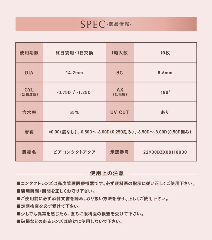 BCは8.6mmのみ、CYLは-0.75と-1.25、Axは180のみ、DIAは14.2mmのみ