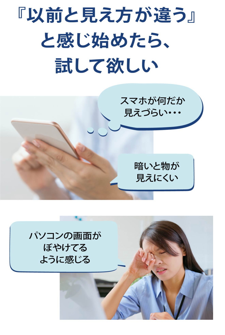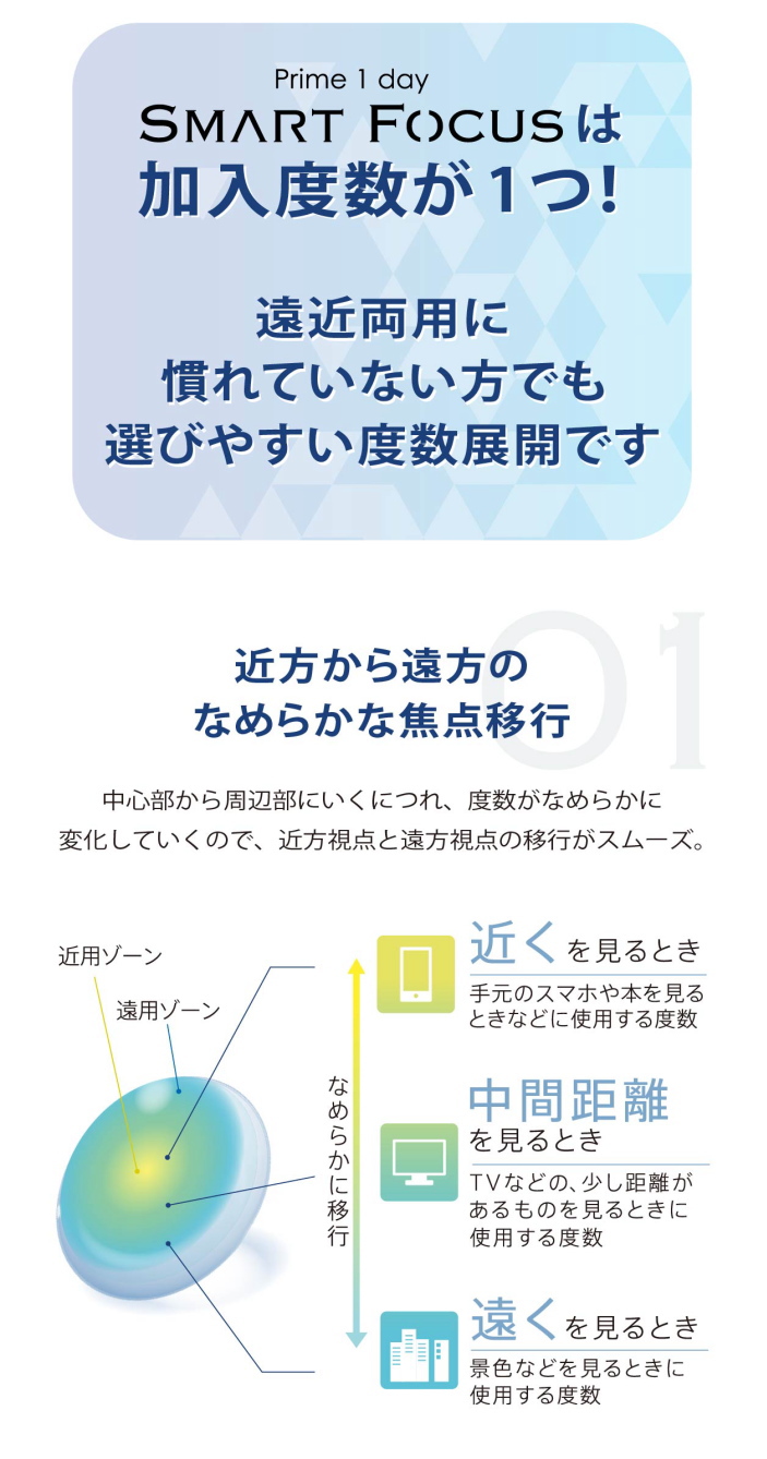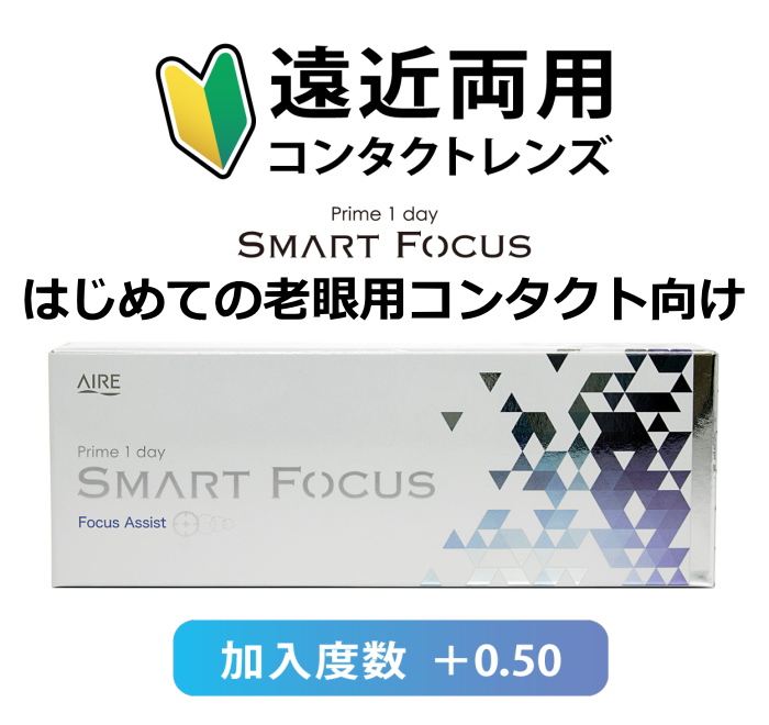 今までの近視用のコンタクトやメガネをつけると近くが見にくくなったと感じたら老眼のなりはじめかもしれません。プライムワンデースマートフォーカスははじめて老眼向けのコンタクト(遠近両用コンタクト)を使う人に向いています。可能性があります。それは加入度という近くを見るためのADD+0.50がという弱い度数なので遠くを見る度数と近くを見る度数の差が小さいのですぐに慣れるからです。遠近両用コンタクトのコツをつかむのにぴったりのレンズです。