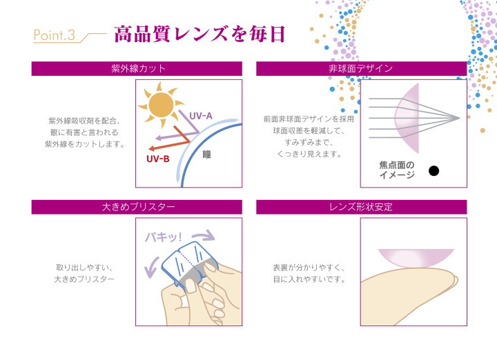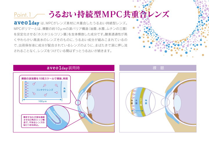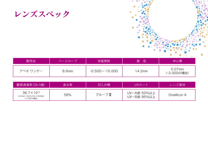 うるおい持続のMPCポリマー共重合多くのコンタクトレンズがうるおい成分を保存液に配合しえいるだけなのに対してアベオワンデーはレンズ素材にうるおい成分のMPCポリマーを共重合しています。だから長時間使用してもうるおい感が持続するのです。非イオン高含水レンズ含水率が58%と高く酸素透過性に優れ、ソフトでやさしい装用感です。さらに非イオン性素材なので汚れを吸着しにくく曇りや乾燥などソフトコンタクトならではの問題をクリアーしています。紫外線カット&非球面デザイン紫外線吸収剤を配合しているので、白内障や角膜炎、加齢黄斑変性症などの眼疾患の原因にもなる紫外線から眼を守ってくれます。紫外線のUV-A波は50%以上、UV-B波は95%以上カットします。製造SUPERMAX社アベオワンデーのスペック