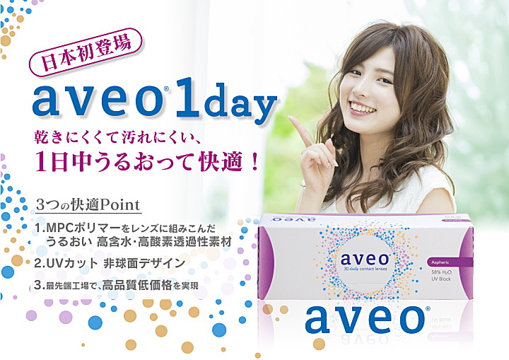 アベオワンデー8箱セット送料無料のアベオワンデー6箱セット。高含水率58%で酸素透過性が高く、レンズ素材にうるおい成分であるMPCポリマーを共重合しています。だから他の保存液にうるおい成分を配合したレンズと違って、涙でうるおいあ成分が洗い流されないのでうるおい感が持続します。さらに紫外線から瞳を守るUVカット機能付きです。価格は安いけれどハイスペックな1日使い捨てコンタクトです。平日17時までの注文なら当日発送いたします。本州や四国であれば最短で翌日お届けも可能です。北海道・九州・沖縄は2日後です。1万円以上購入で送料無料さらに代引き手数料も後払い手数料も無料です。アベオワンデー