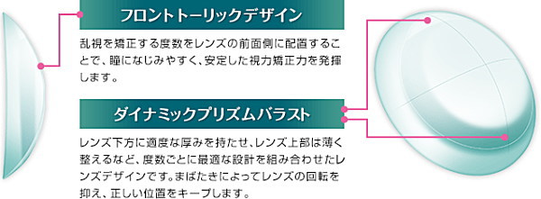 乱視を矯正する乱視度数はレンズの前面に配置したフロントトーリックデザインを採用しています。眼球側は球面になるので角膜にフィットして安定感がよく、つけ心地も快適です。
